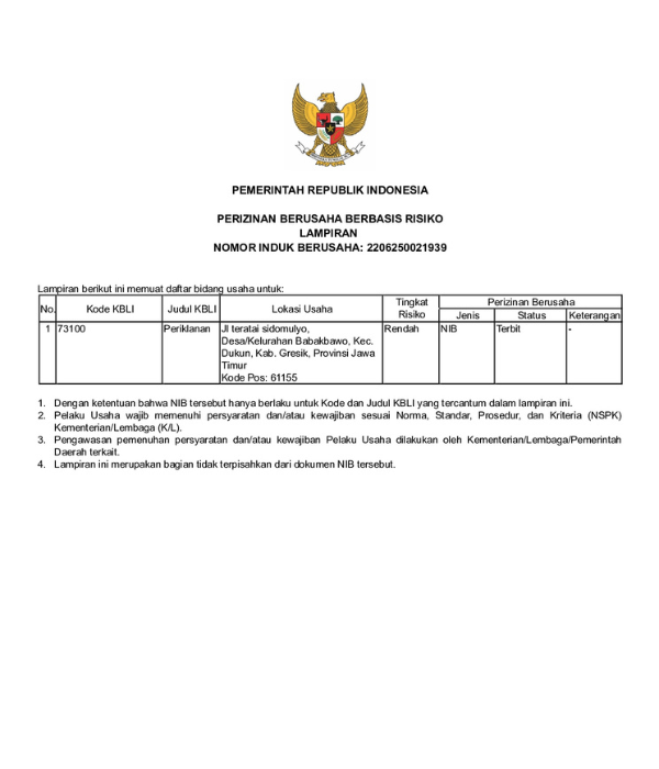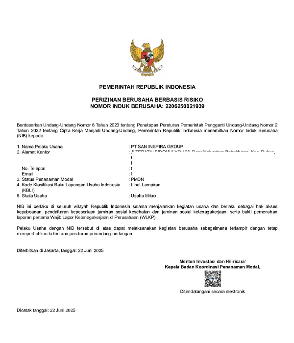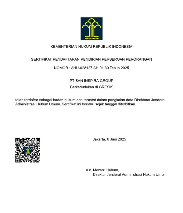 Kami beroperasi secara resmi dengan dukungan dokumen legal yang lengkap dan sesuai dengan peraturan yang berlaku, sebagai bentuk tanggung jawab dan transparansi kepada mitra dan pelanggan.